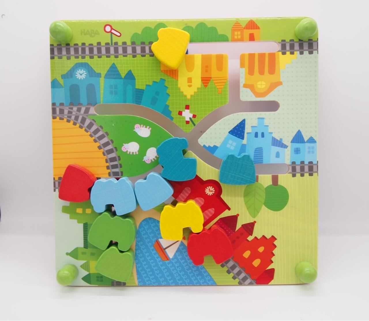 おもて面には町の絵が描かれていて、電車が町の中を走っているようすを想像しながら遊べる楽しいデザイン。うら面はカラフルな「色」があふれるデザインになっています。スライドボードは、特に「書く(描く)」という動作につながる手の機能を高めてくれるおもちゃです。ノブをつまみ、いろんな方向に手を動かすことで自然と指先や手首を柔らかくしてくれますし、腕の運動機能も高めてくれます。