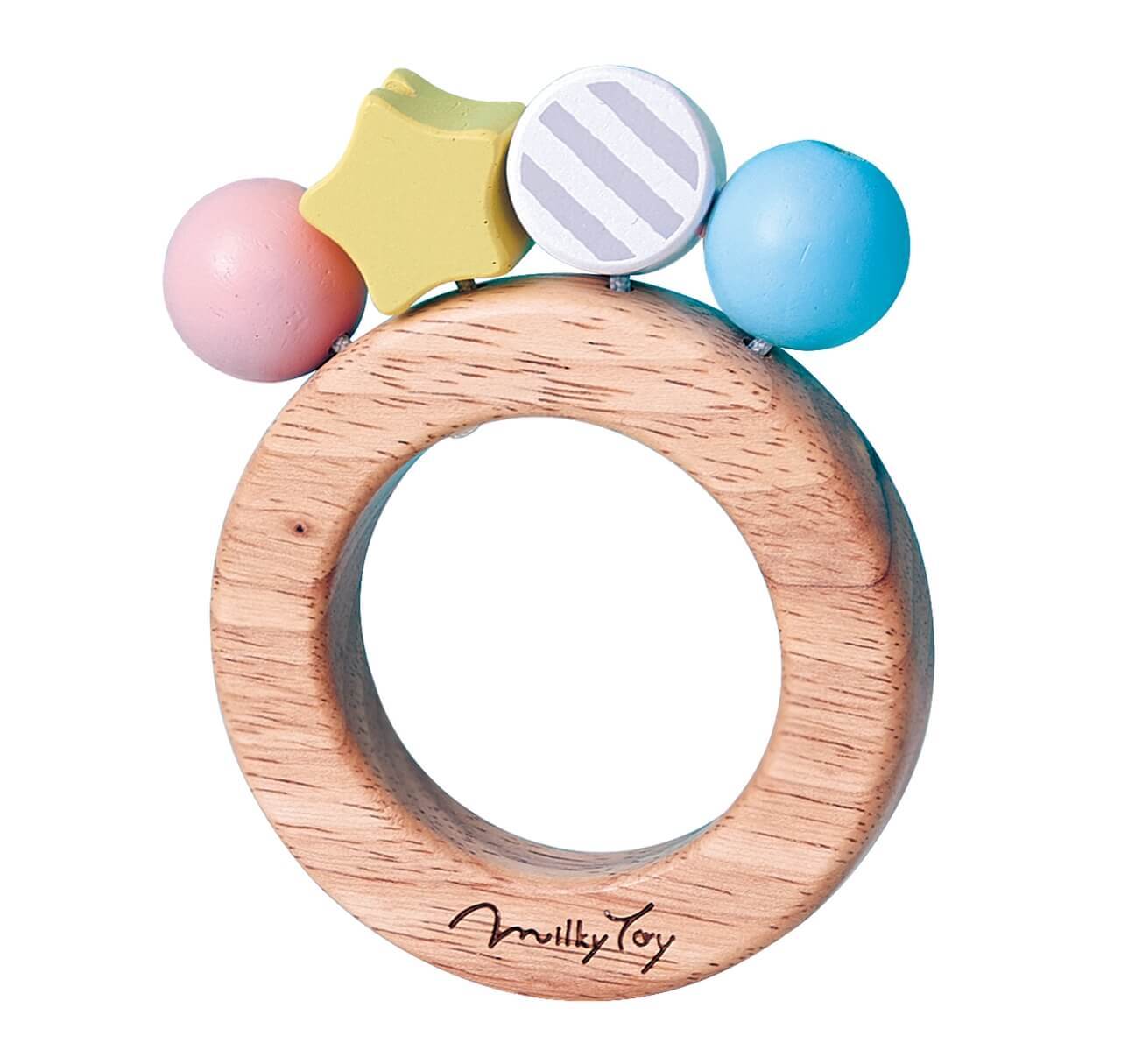 [触る・にぎる・口に入れる・動かすを促す遊び] 球、円柱、星の3種の形を組み合わせることで目にも楽しく、振るとカラコロとやさしい音を奏でます。